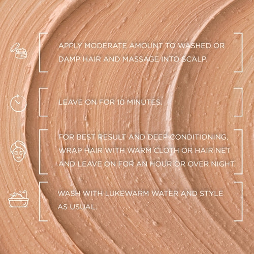 Apply generously from mid-lengths to ends on clean, damp hair. Leave on 10–15 minutes; rinse thoroughly.